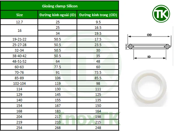 | Bảng kích thước cụ thể của ron gioăng clamp silicon | ||