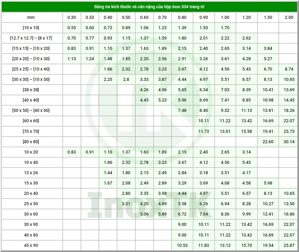 Bảng tra kích thước và cân nặng của hộp inox 304 trang trí | ||||||||||||