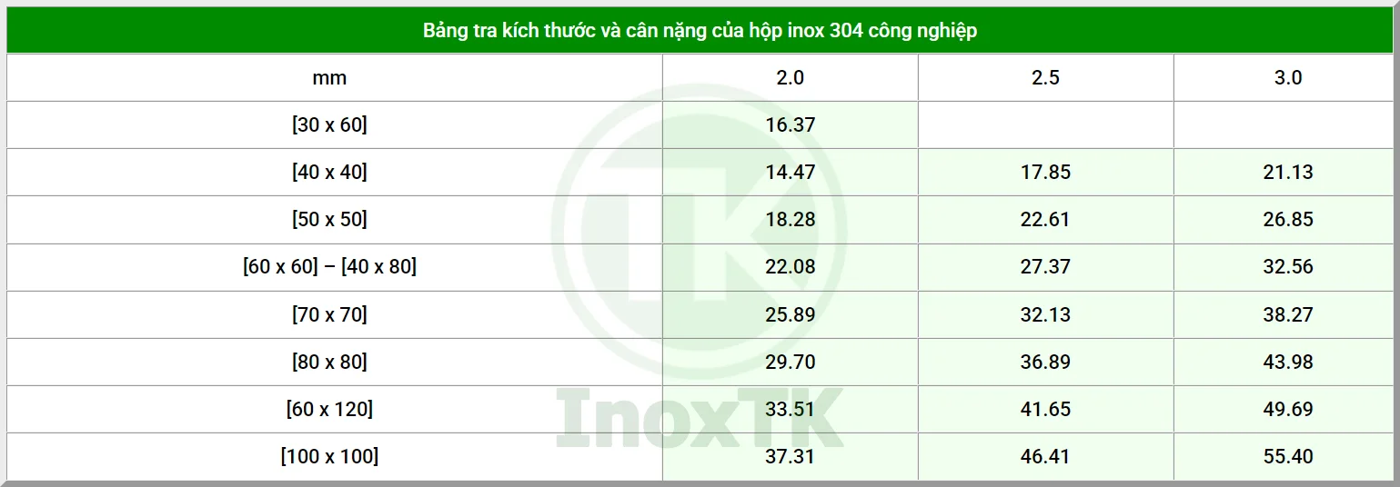 Bảng tra kích thước và cân nặng của hộp inox 304 công nghiệp | |||
