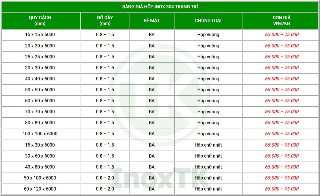 Lưu ý, mức giá chính xác còn phụ thuộc vào nhiều yếu tố khác như thị trường, kích thước, số lượng,… Để nhận báo giá chính xác nhất, vui lòng liên hệ trực tiếp với Inox TK.