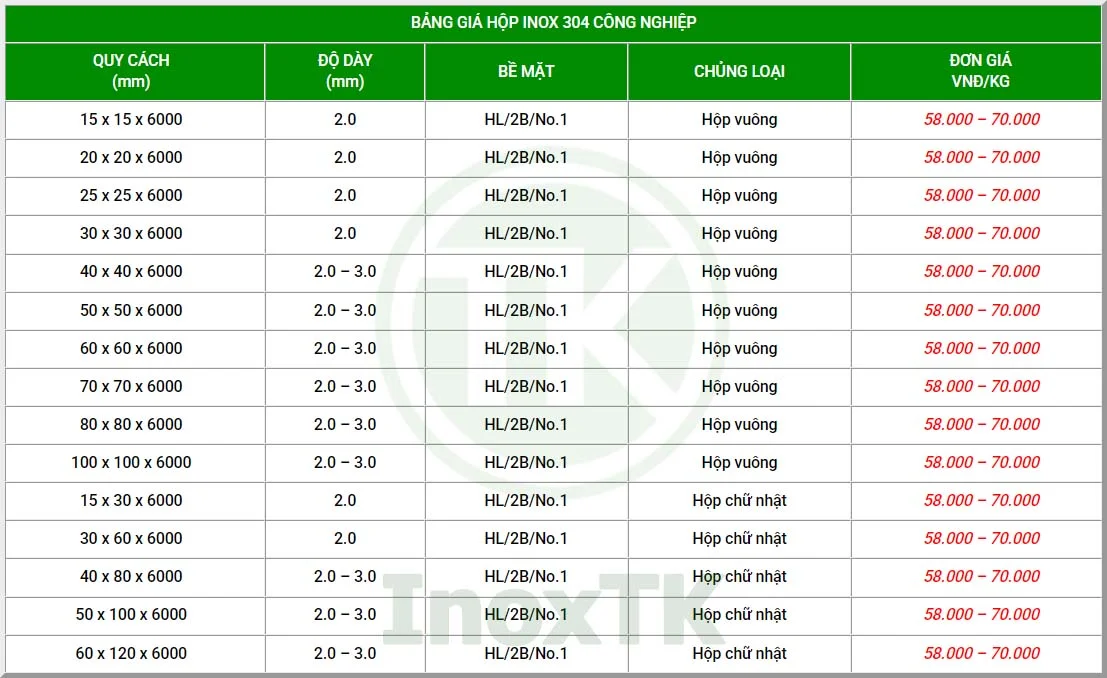 Dưới đây là bảng giá tham khảo của các loại hộp inox công nghiệp. Lưu ý, mức giá chính xác còn phụ thuộc vào nhiều yếu tố khác như thị trường, kích thước, số lượng,… Để nhận báo giá chính xác nhất, vui lòng liên hệ trực tiếp với Inox TK.