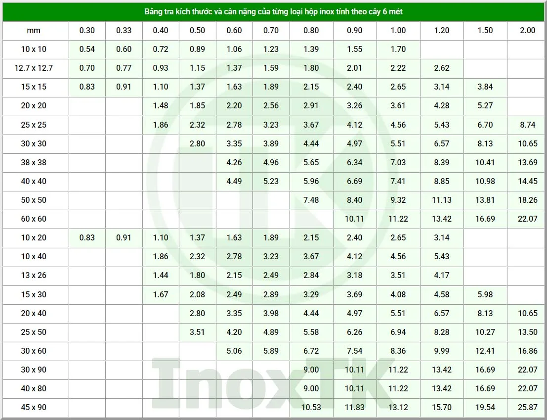 Bảng tra kích thước và cân nặng của từng loại hộp inox tính theo cây 6 mét | ||||||||||||