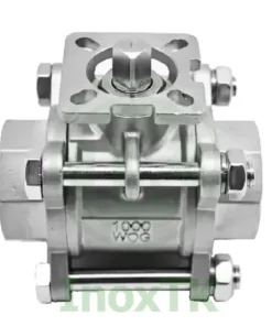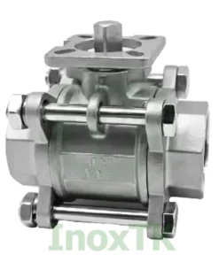Van bi 3PC có tán nối ren inox là một loại van bi được thiết kế với thân chia làm ba mảnh – gồm hai đầu nối ren và phần thân giữa chứa quả bi. Điểm nổi bật là phần tán đỡ gắn bộ điều khiển, thường nằm trên thân giữa, có các lỗ bắt vít theo tiêu chuẩn ISO. Đây chính là điểm cho phép van lắp được các thiết bị truyền động khí nén/điện dễ dàng và chắc chắn.